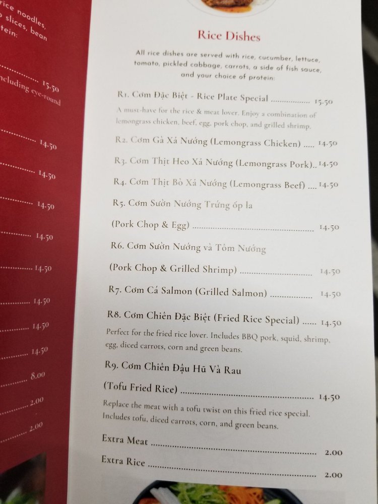 Includes steamed rice, lemongrass pork chop, fried egg, pickled daikon/carrots, cucumbers, and lettuce served with diluted fish sauce dressing on the side.
